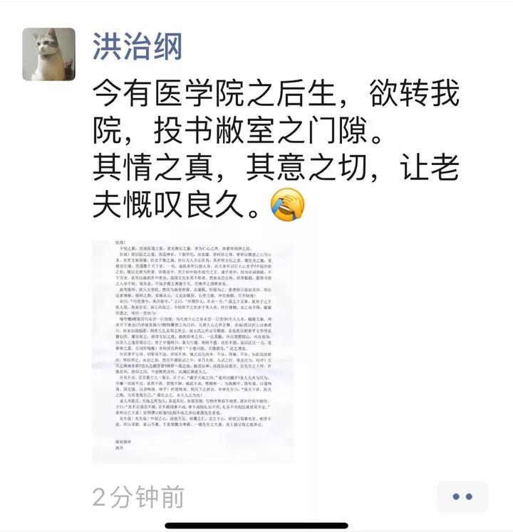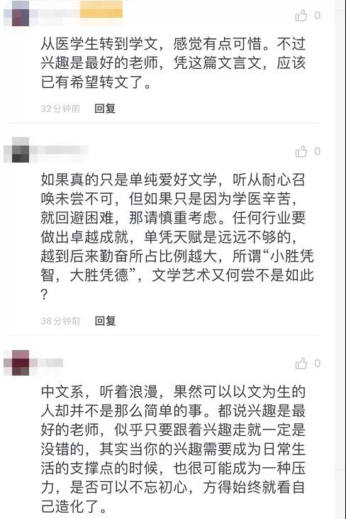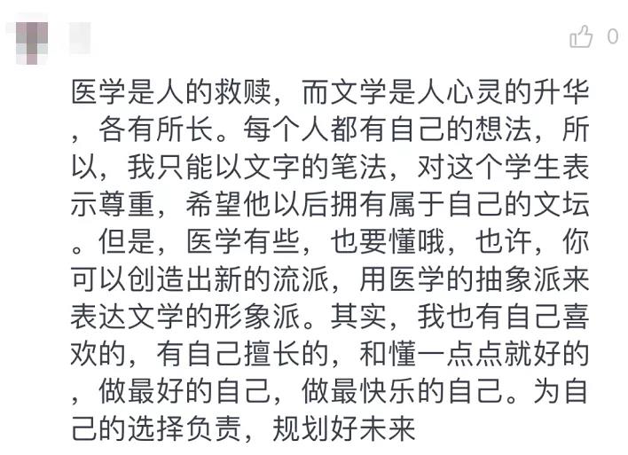 如今的大环境下,“实用主义”的专业更受欢迎。医学院的学生要转中文系,其实是很让人感叹的。他把这封信拍照发到朋友圈,有了不少评论点赞:“这是要弃医从文啊!”