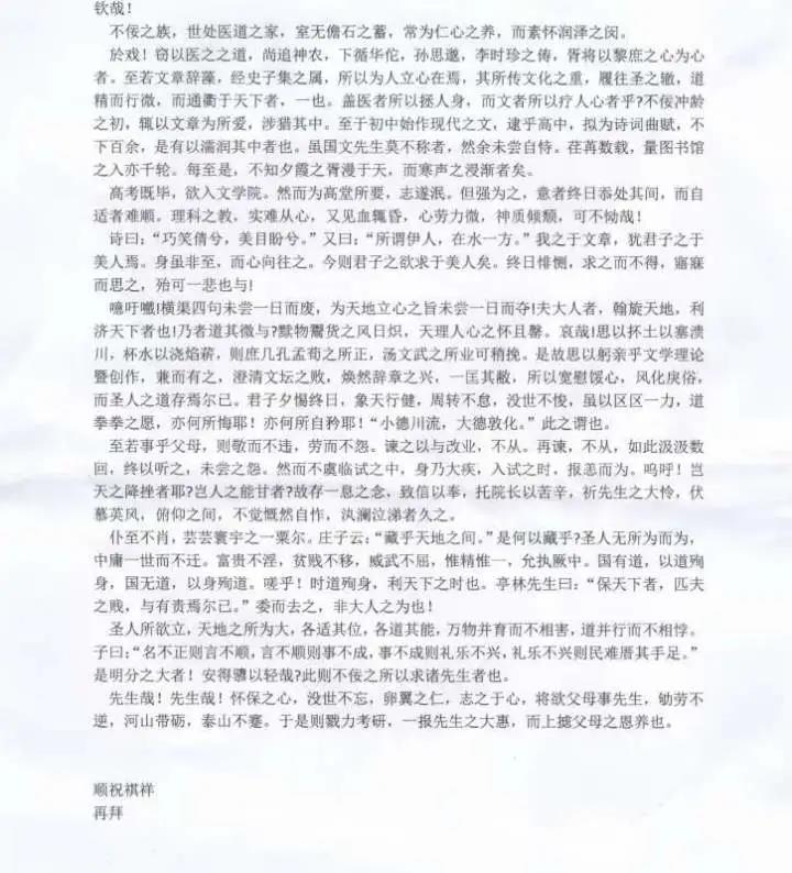 先生哉!先生哉!怀保之心,没世不忘,卵翼之仁,志之于心,将欲父母事先生,劬劳不逆,河山带砺,泰山不蹇。于是则戮力考研,一报先生之大惠,而上摅父母之恩养也。