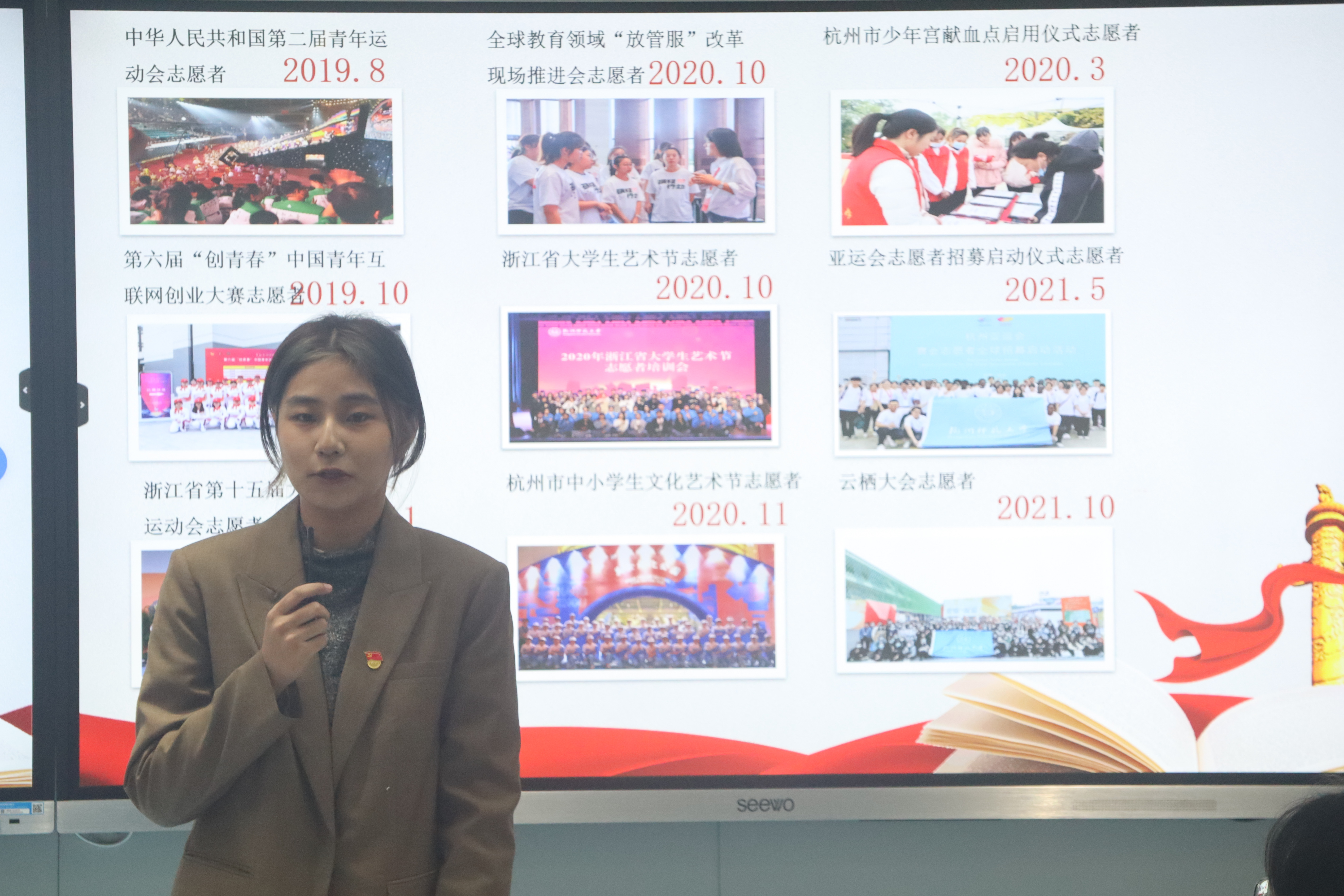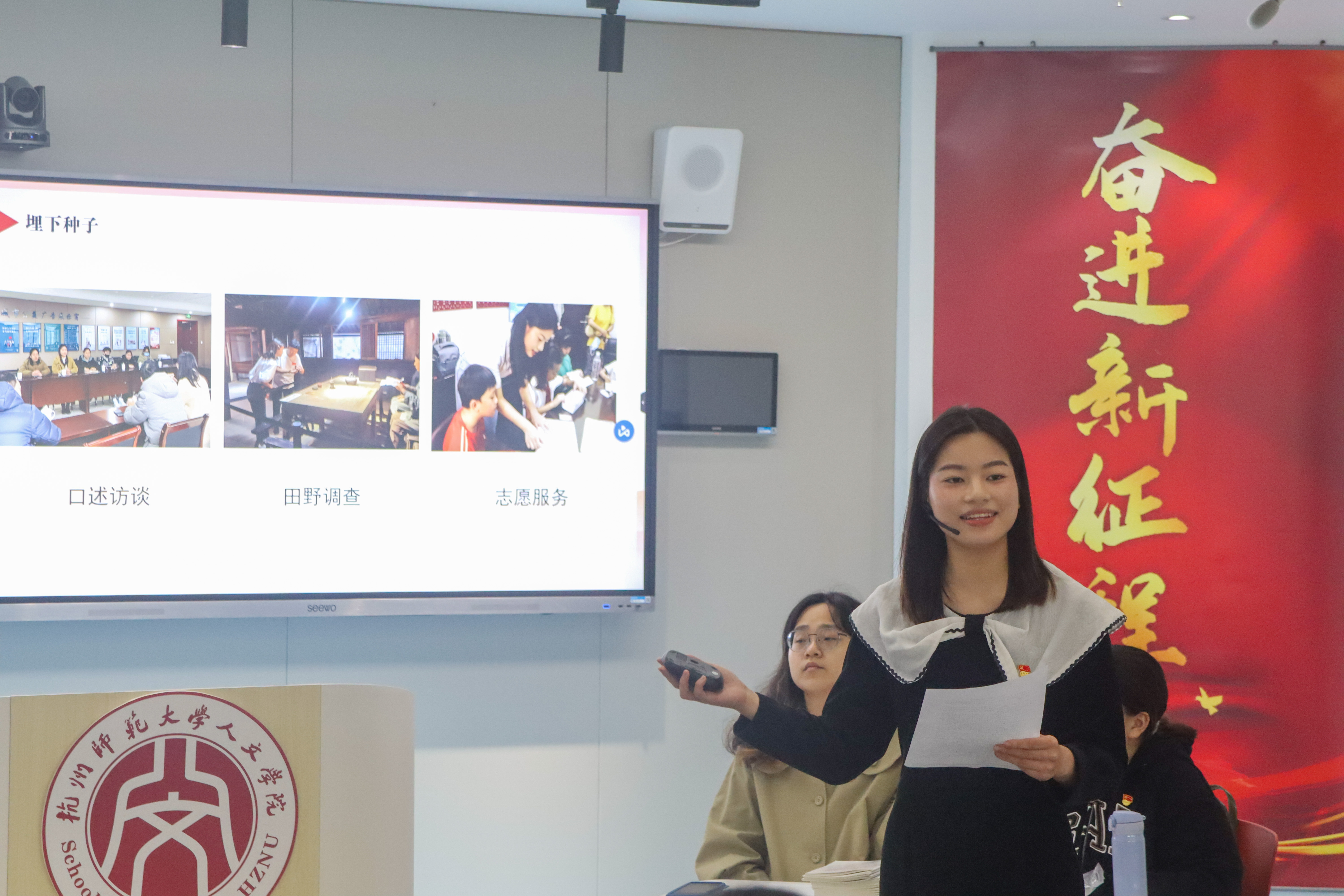 会议伊始,本科生第一党支部党员代表作了党的二十大精神学习专题报告。本科生第一党支部学生党员陈佳滢作为 人妖 “耕远”文化团队负责人、杭州市金牌宣讲员,结合自己带领“耕远”文化团队和“莓美与共”实践团队口述访谈、田野调查、志愿服务等的具体实践,详细阐述了她对习近平总书记在党的二十大报告中关于当代中国青年相关论述的理解。曾任 人妖 青年志愿者协会会长、获得“浙江省优秀共青团员”称号的本科生第一党支部学生党员殷沁雅结合自身志愿服务经历,分“以青春之我担时代之任”、“以奋斗之姿与时代逐梦”、“以青春梦想书写新时代篇章”三部分论述了自己对习近平总书记在党的二十大报告中对新时代青年寄语的理解,进一步呼吁广大青年“让青春在全面建设社会主义现代化国家的火热实践中绽放绚丽之花”。