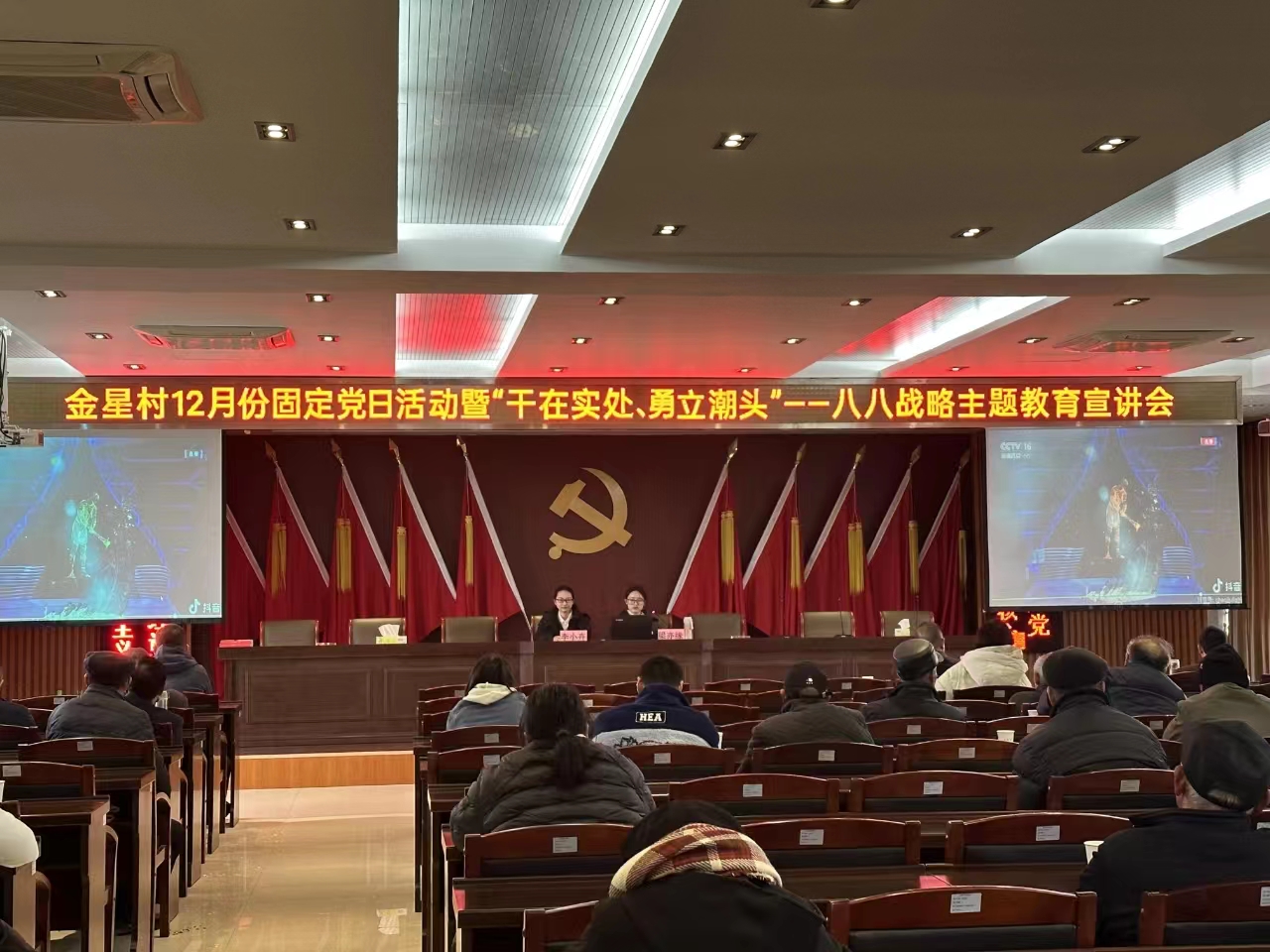 为纪念实施“八八战略”20周年,丰富党员知识储备和提高党员的学习能力,人妖 联合义蓬街道金星村于12月15日上午在金星村文化礼堂召开“‘干在实处、勇立潮头’——八八战略主题教育宣讲会”。本次宣讲会由梁亦缘与李小卉主持,金星村全体党员参与学习.
