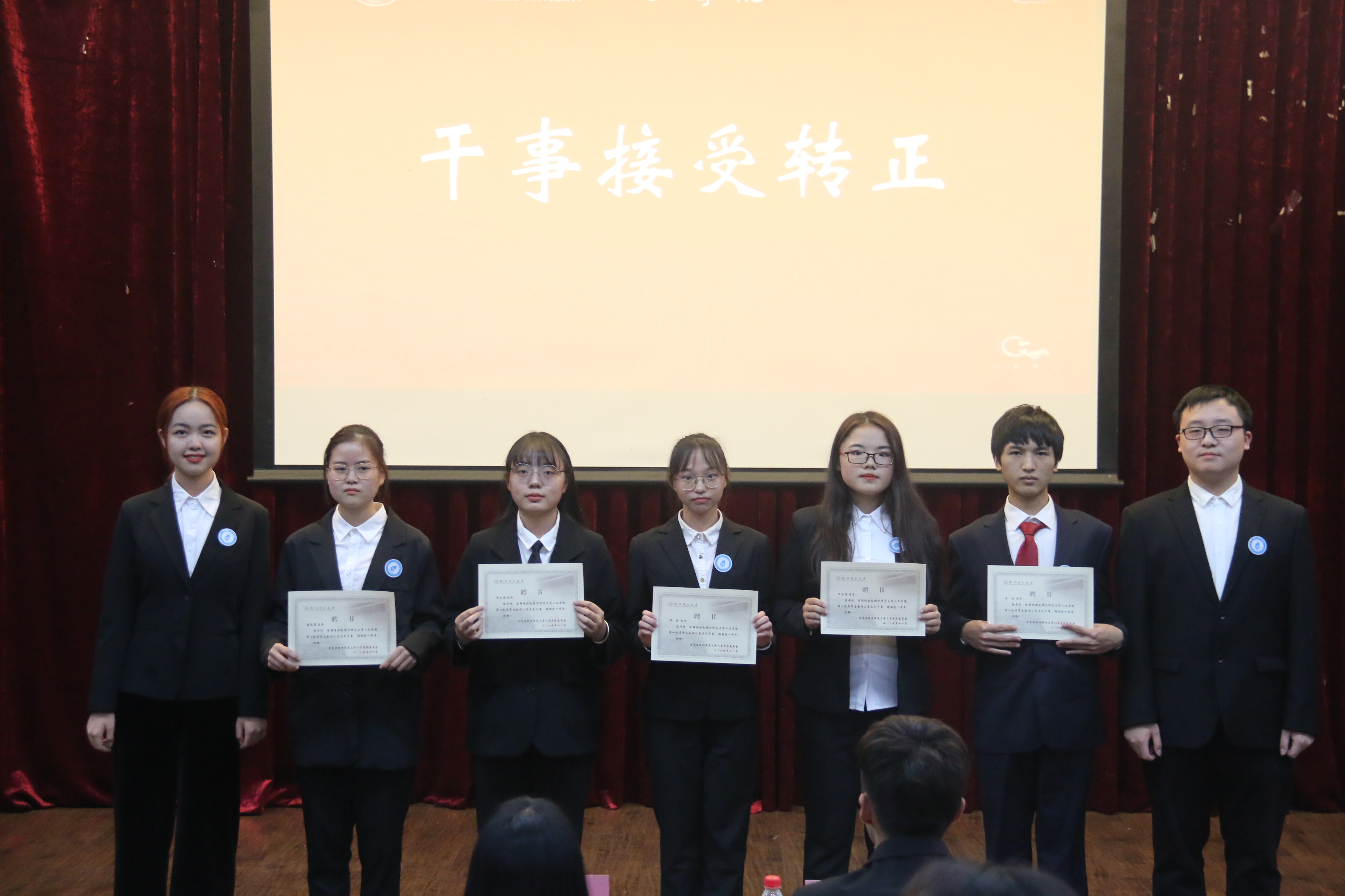 各代表发言结束后,举行主席团和部长受聘仪式,由刘华章老师颁发证书并合影留念。随后,举行干事转正仪式,由各部门部长授予聘书并合影留念。最后,转正大会在全体成员合唱《爱因为在心中》与合照留念中结束。(文/刘千瑜、图/潘天晶)