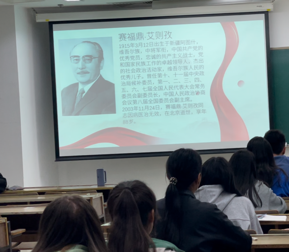 迪力胡马同学为同学介绍了优秀共产党员赛福鼎·艾则孜同志。赛福鼎·艾则孜是中国共产党优秀党员,忠诚的共产主义战士,党和国家民族工作的卓越领导人,杰出的社会政治活动家。在七十多年年的革命生涯中,他出生入死、顽强奋斗,把毕生的精力奉献给了中国革命、建设和改革事业,在政治、经济、文化、民族工作等方面都有突出建树。2003年11月24日,赛福鼎·艾则孜同志因病医治无效,在北京逝世,享年88岁。他的光辉业绩和卓越功勋,深深铭记在我们心中。他的革命精神和崇高品格,永远值得我们学习和怀念。