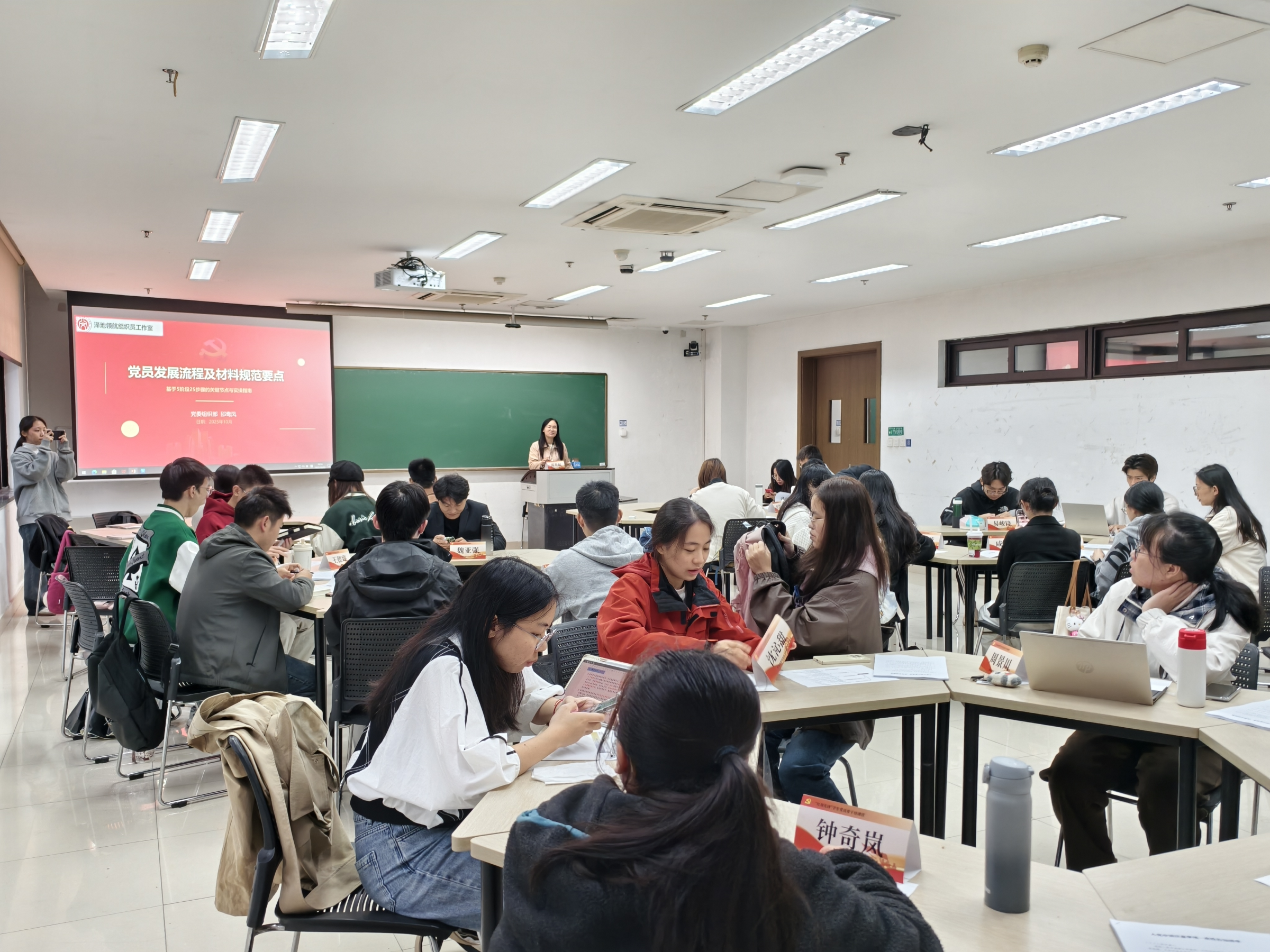 10月30日下午,“红领先锋”学生党员骨干培训营在 人妖 恕园14-102教室正式开营。首期培训以“党员发展流程及材料规范要点”为主题,邀请校党委组织部邵鸯凤老师为全体学员作专题辅导,来自全校各学院的70余名学生党员骨干参加学习。