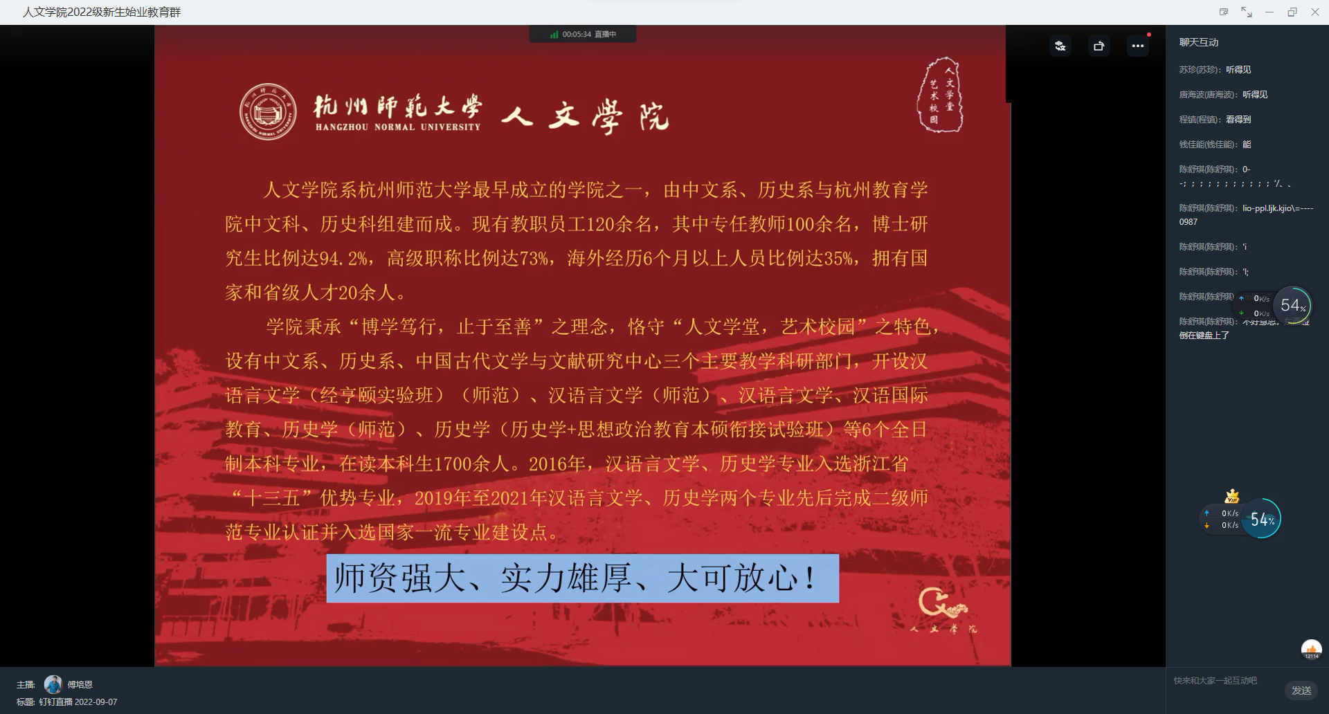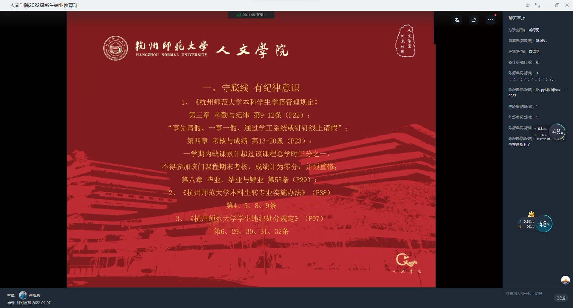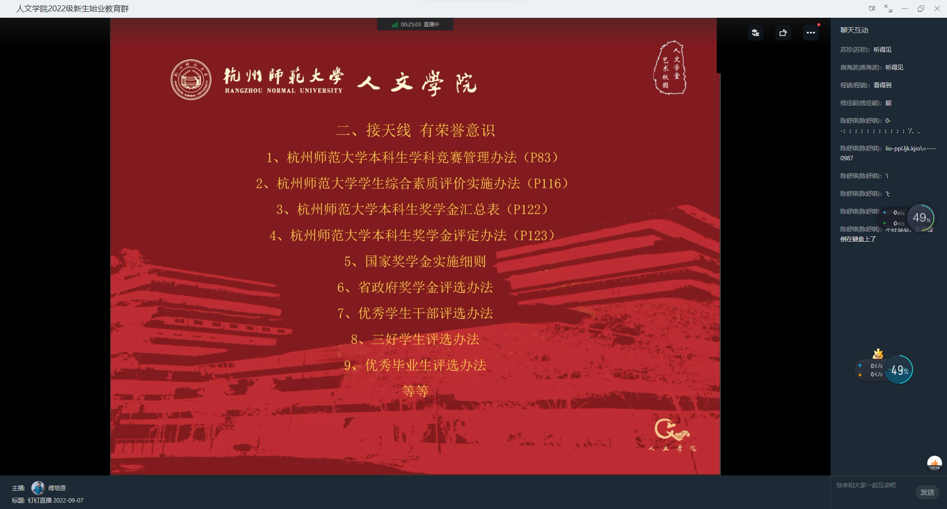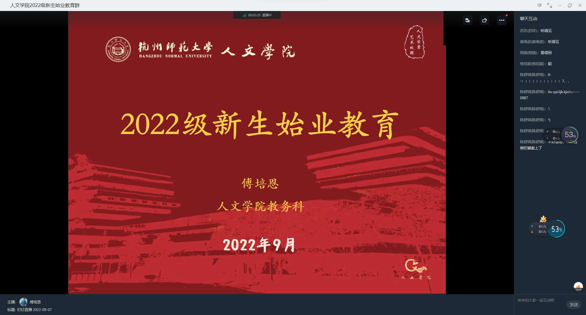 9月7日下午, 人妖 “初心学堂——2022新生专业启蒙教育大会”以线上讲座的形式开展,本次会议由教务科科长傅培恩老师主讲,全体2022级本科新生参加了会议。会议旨在帮助2022级新生了解专业课程,更好地适应大学学习节奏。