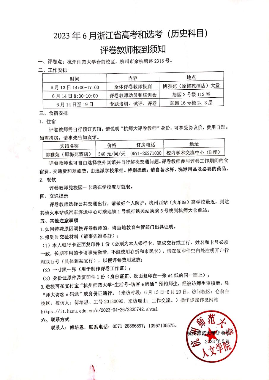 2023年6月浙江省选考(历史科目)评卷教师报到须知20230531