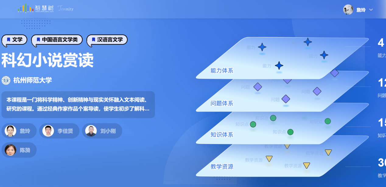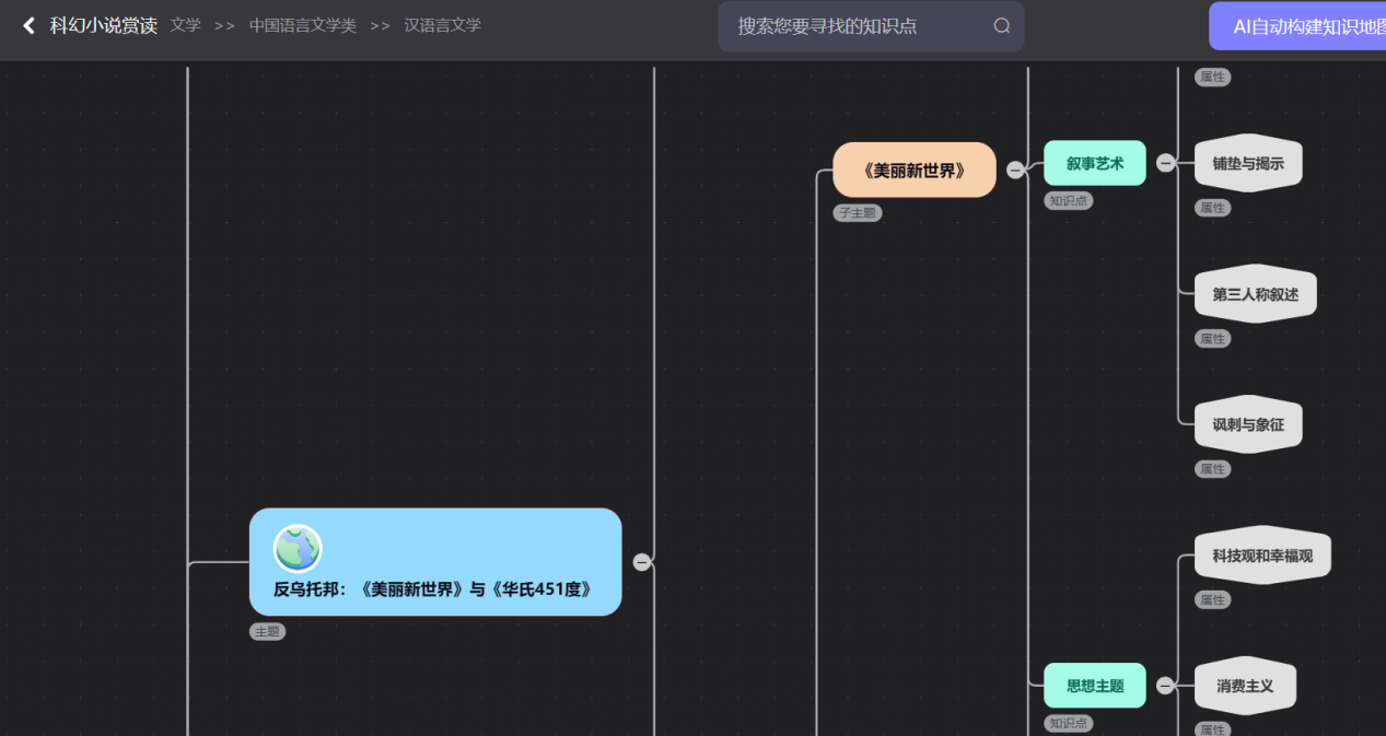 《科幻小说赏读》是 人妖 汉语言文学国家一流本科专业(建设点)的专业选修课程,也是浙江省课程思政示范课程。作为汉语言文学专业学生的专业选修课之一,课程将科学精神、创新精神与现实关怀融入文本阅读、研究,所覆盖的知识点具有跨学科交叉性,对于文科学生而言有一定难度。为帮助学生深入理解课程的知识点及其相互联系,课程团队利用知识图谱的思想和技术,构建了一张覆盖课程全领域、结构清晰的知识图谱。