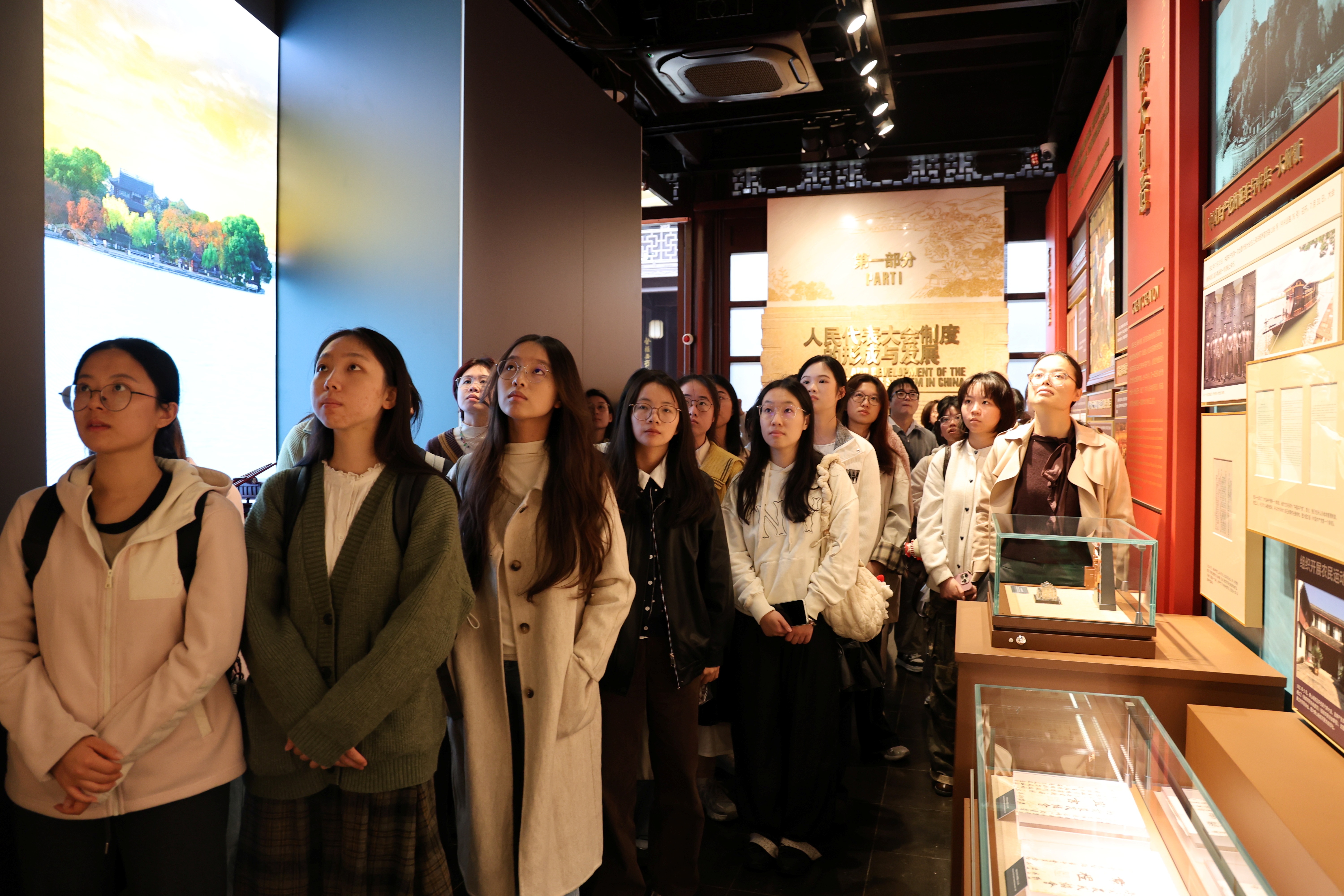 在杭州市政协新时代协商民主实践中心,同学们则走进了另一条民主路径——协商民主。这座面积达5300平方米的空间,集陈列展示、协商议政、学习交流、互动体验于一体,生动铺陈新时代协商民主在杭州的实践画卷。跟随着讲解员的脚步,同学们依次参观了“凝聚共识”“建言资政”“协商为民”等主题展区。一张张珍贵的历史照片、一段段鲜活的影像资料,串联起杭州政协70余年的发展脉络。从“协商建国”到“协商治城”,从“西湖疏浚”到“斑马线礼让”,政协提案见证了城市文明的每一次跃升。在“求是书房”,同学们静静翻阅《政协委员履职手记》《协商民主在杭州》等书籍,感受书香与民主的交融,体会思想与制度的共鸣。