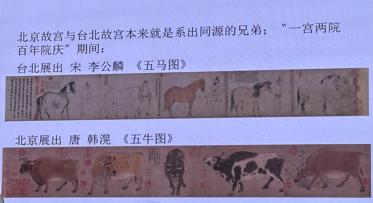 讲座临近尾声,林教授特别提及故宫博物院百年院庆时的一段佳话:北京故宫展出《五牛图》,台北故宫同期展出《五马图》。这一奇妙的巧合,宛如一场跨越海峡的文化对话。他意有所指地指出:两岸故宫虽隔一湾海峡,但文化根脉则是同源同宗。正如百年院庆期间两故宫不谋而合的展出《五牛图》与《五马图》,这种巧合似乎来自于同是中华民族深厚的文化底蕴与厚重的历史记忆。